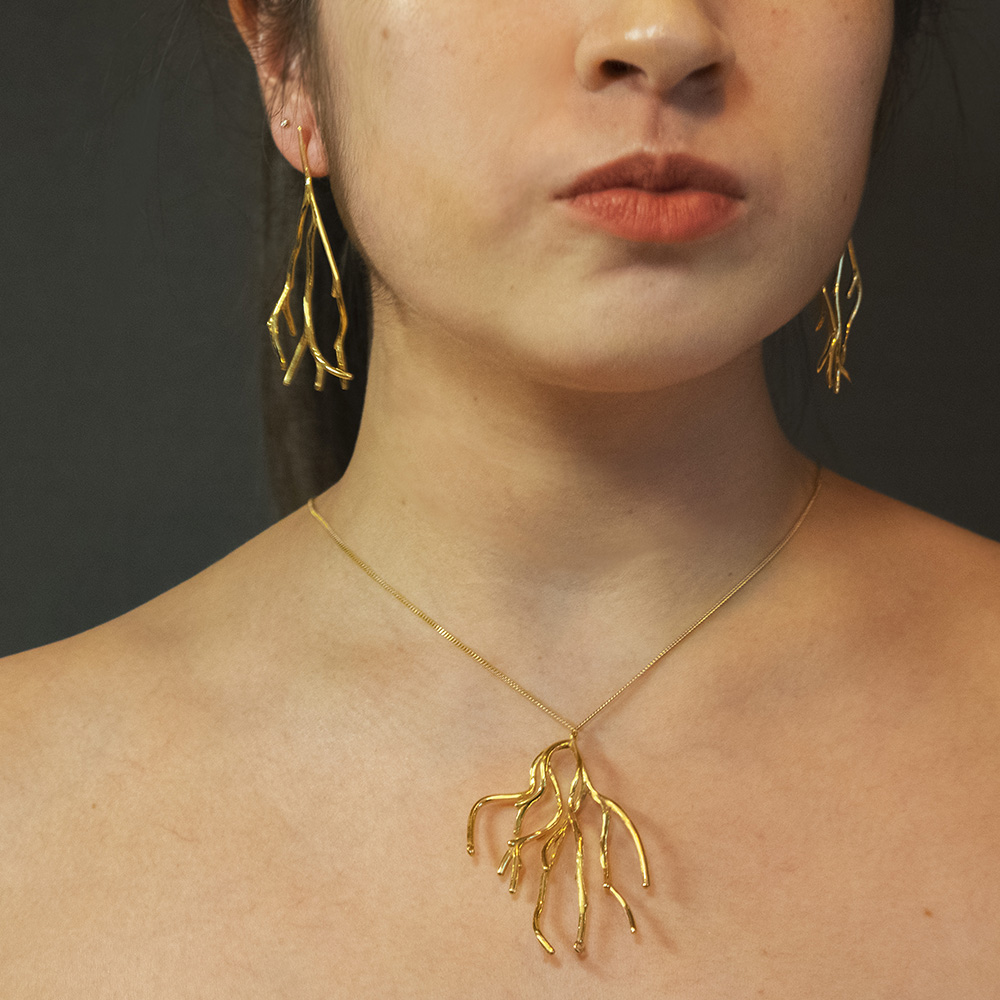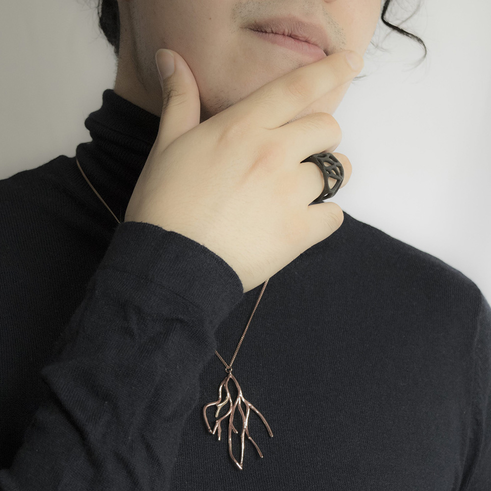 Alga 2 está generada a partir de parámetros que simulan el crecimiento natural, formando geometrías que imitan la flora acuática como algas o corales. Diseño original de Eduardo Luce y Mariana Estrada mediante softwares de programación geométrica ©.