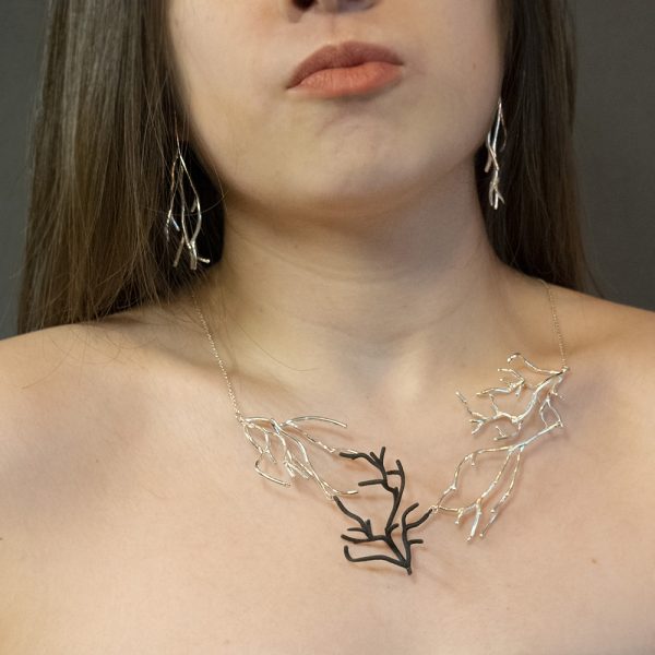 Un collar del Alga de tu elección con el par de Aretes, haciendo el conjunto perfecto para lucir y combinar contigo. Geometrías generadas a partir de parámetros que simulan el crecimiento natural, imitando la flora acuática como algas o corales. Diseño original de Eduardo Luce y Mariana Estrada mediante softwares de programación geométrica.