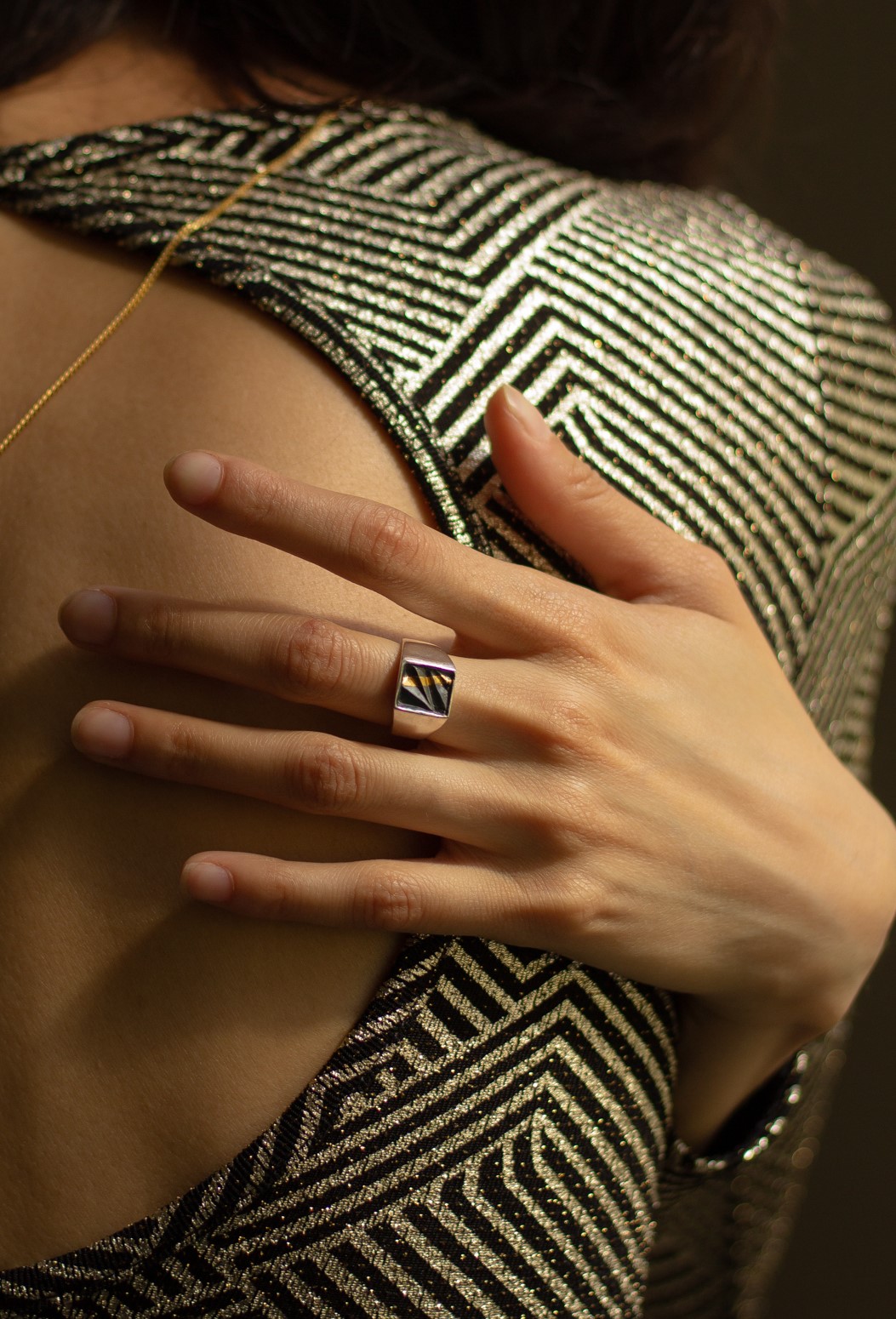 La colección Scodelaria abstrae las características de un gato carey a la geometría selecta que distingue a Herpeton aunado a la técnica keum-boo, donde una fina lamina de oro puro es adherida a la plata.