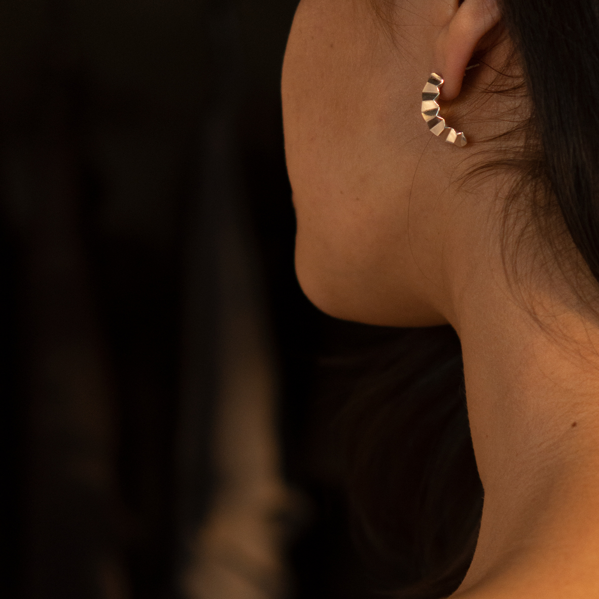 Par de aretes facetados de plata reciclada en acabado pulido. Incluye mariposa.