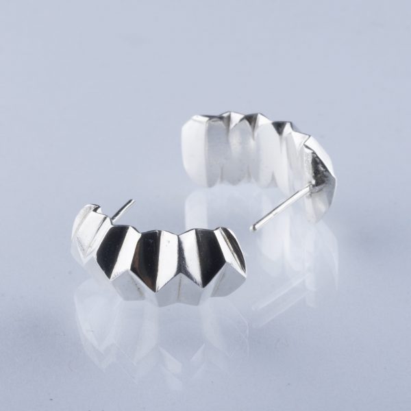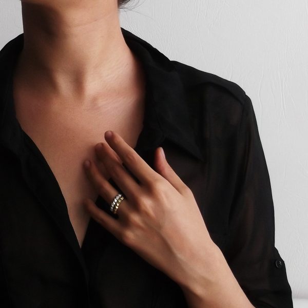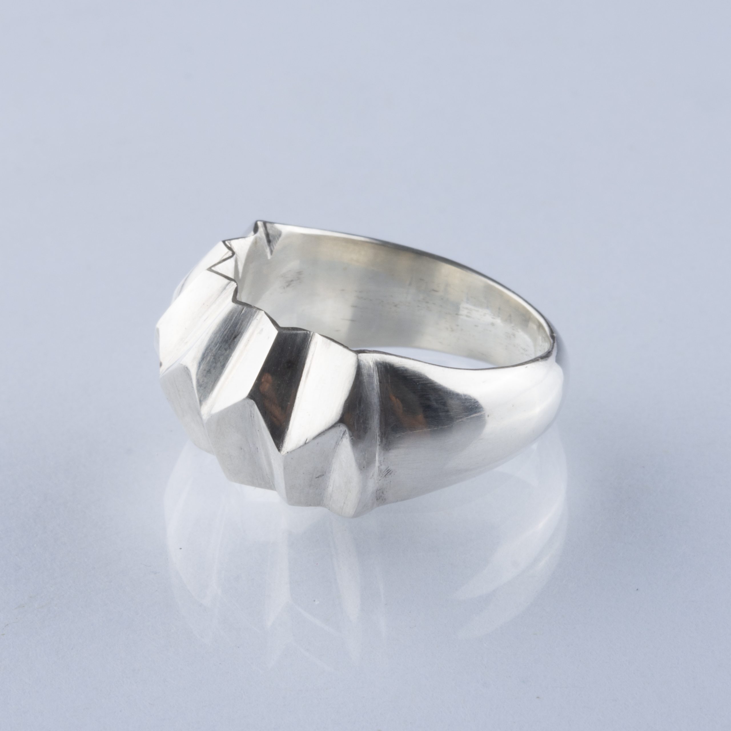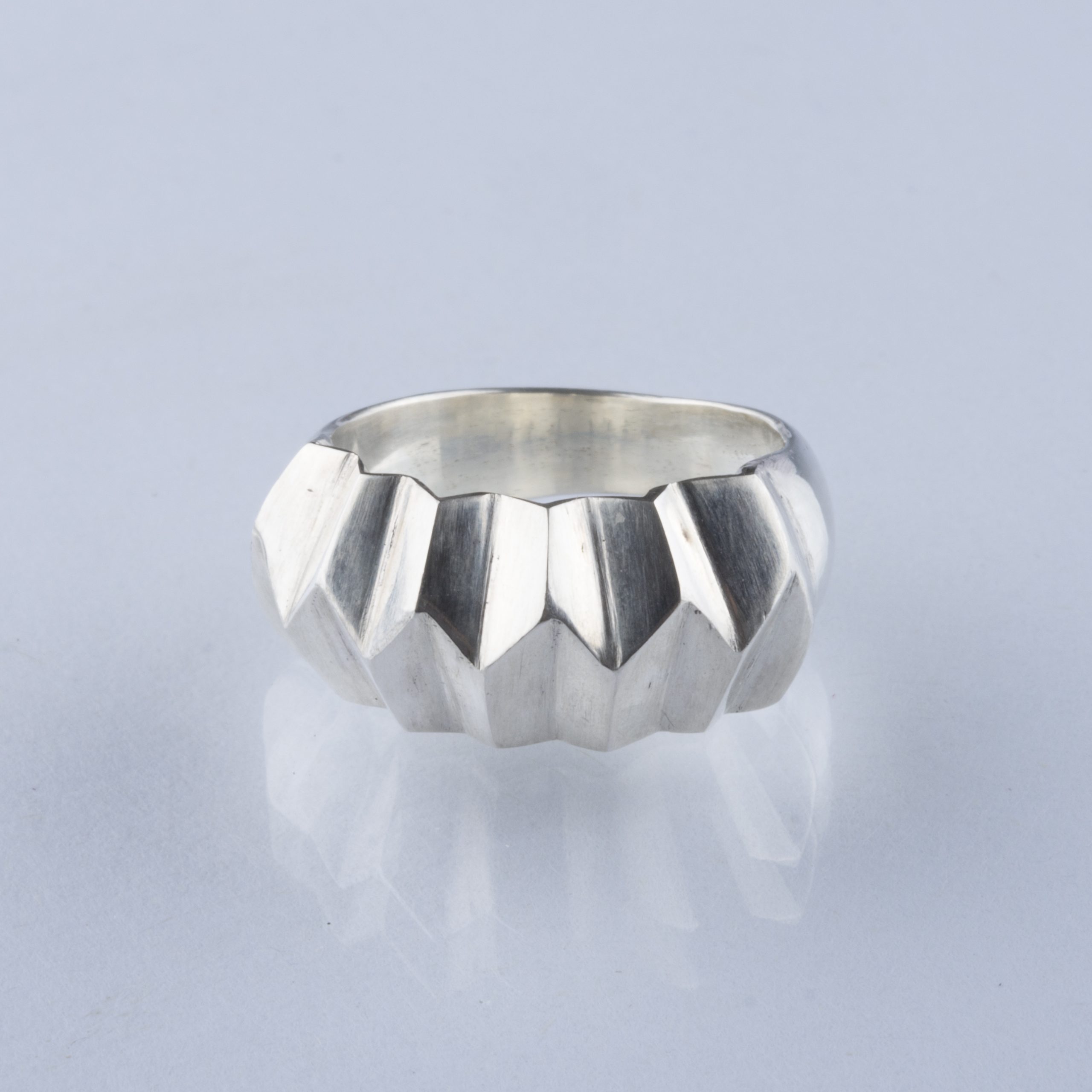 Anillo facetado de plata reciclada en acabado pulido.